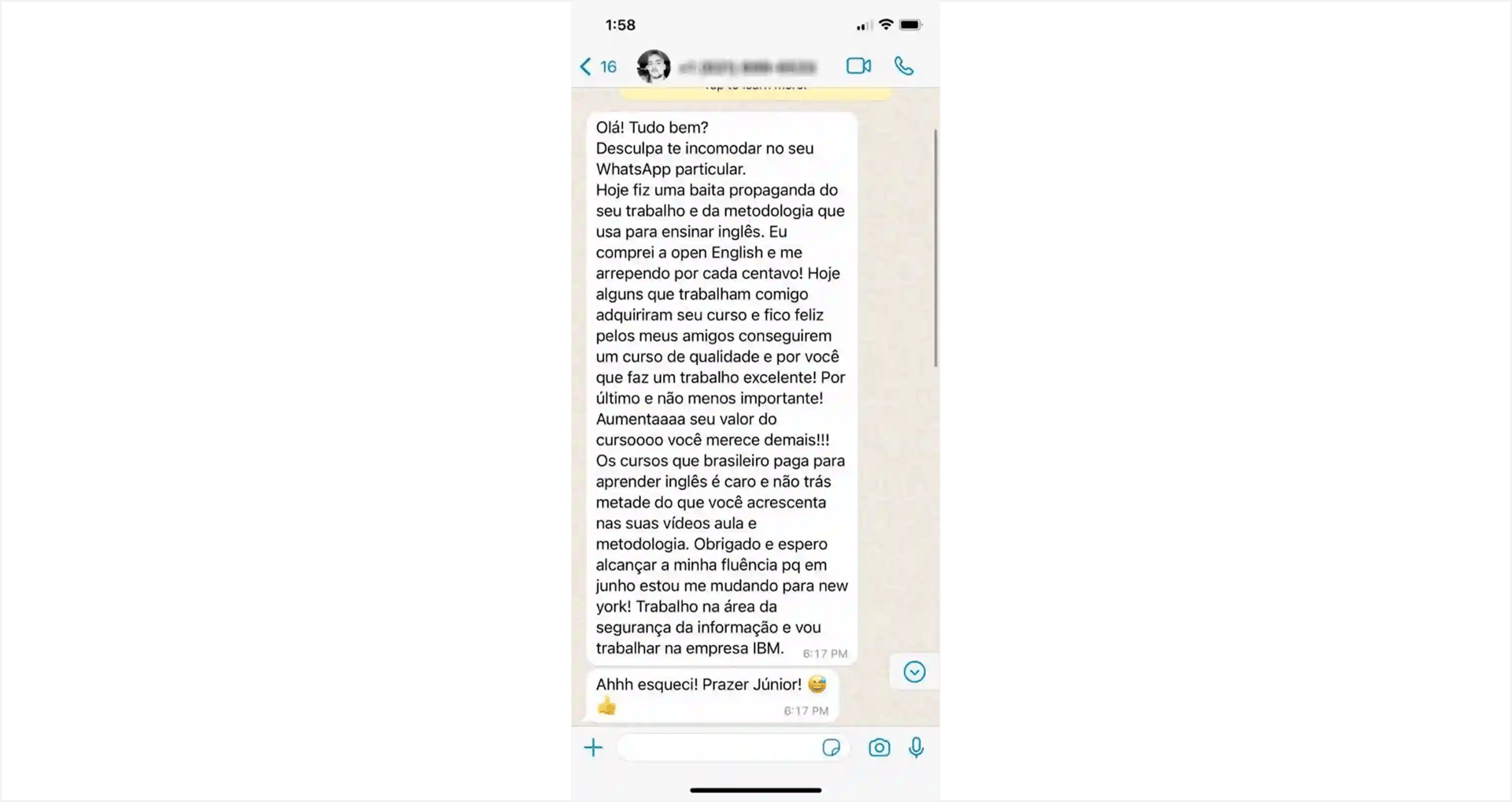 Estou simplesmente amando as aulas de conversação. Aprendendo mais do que eu imaginei, muito obrigado pela sua simpatia em ensinar e eu dou muita risada (bom sentido) com as lives de conversação